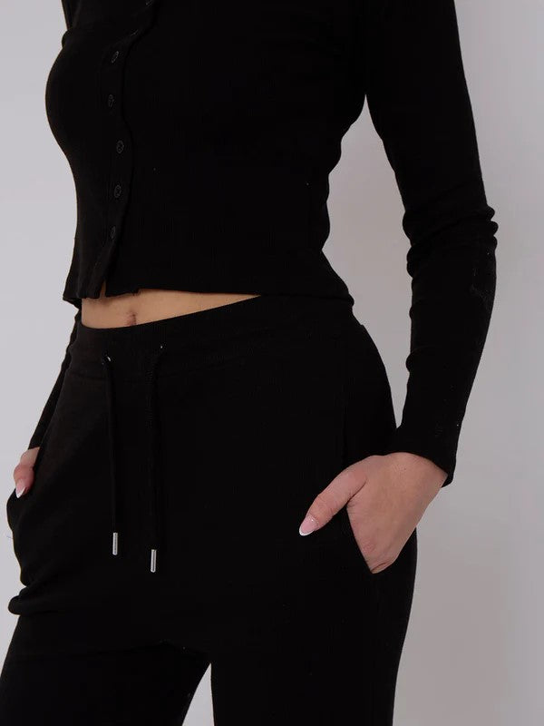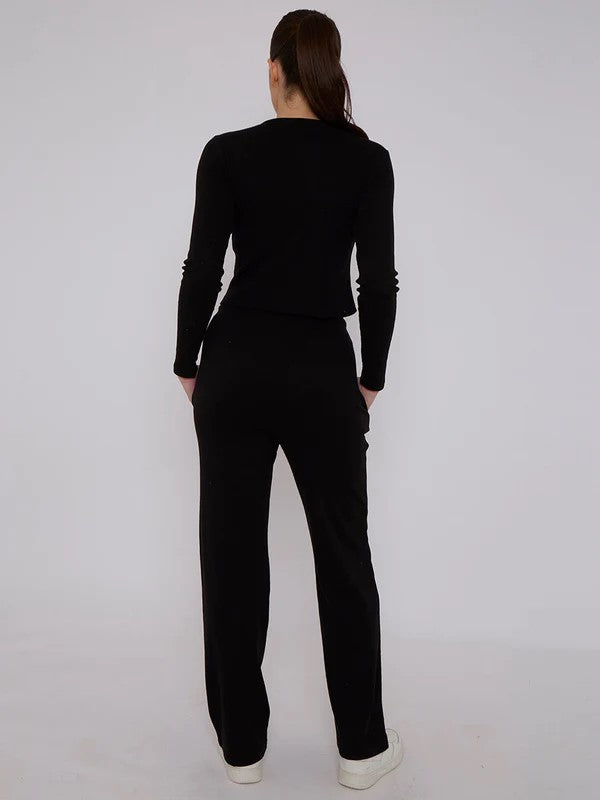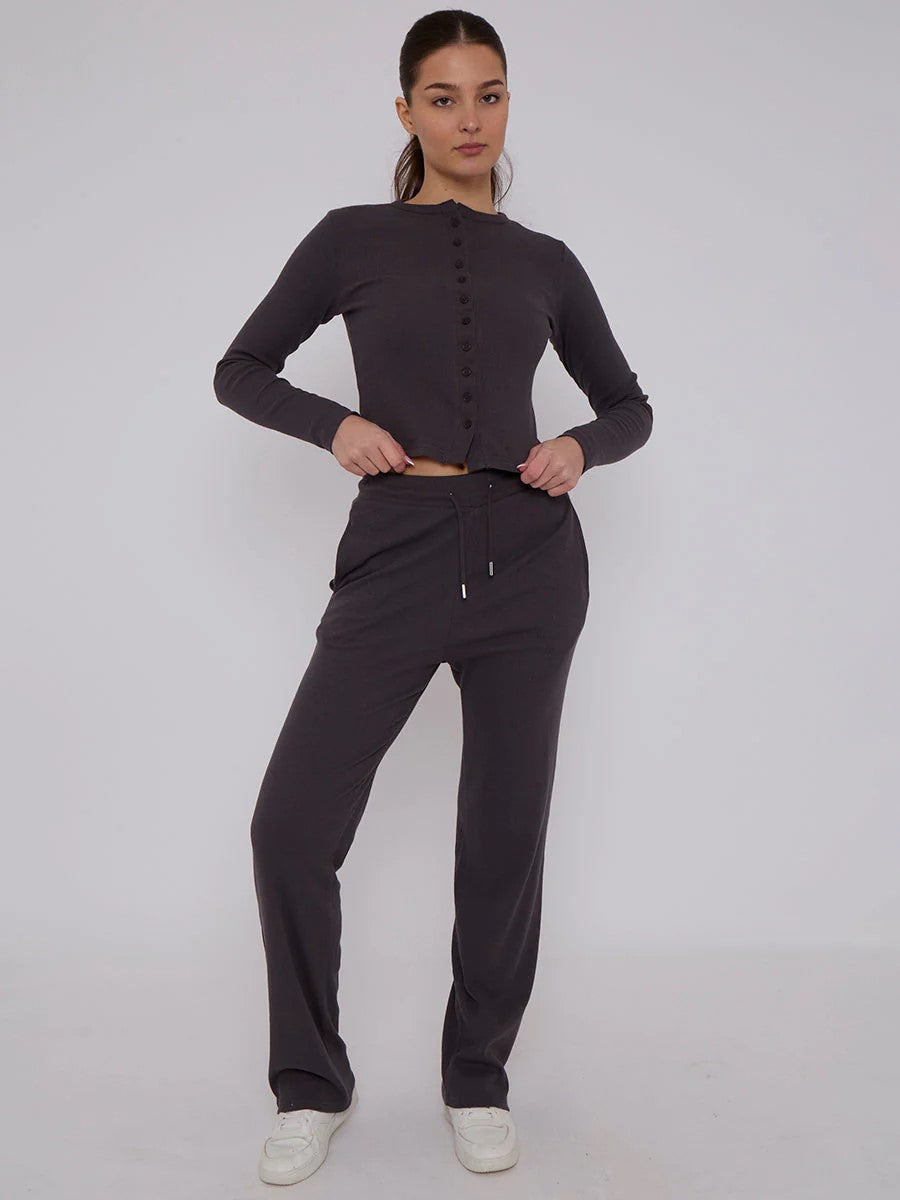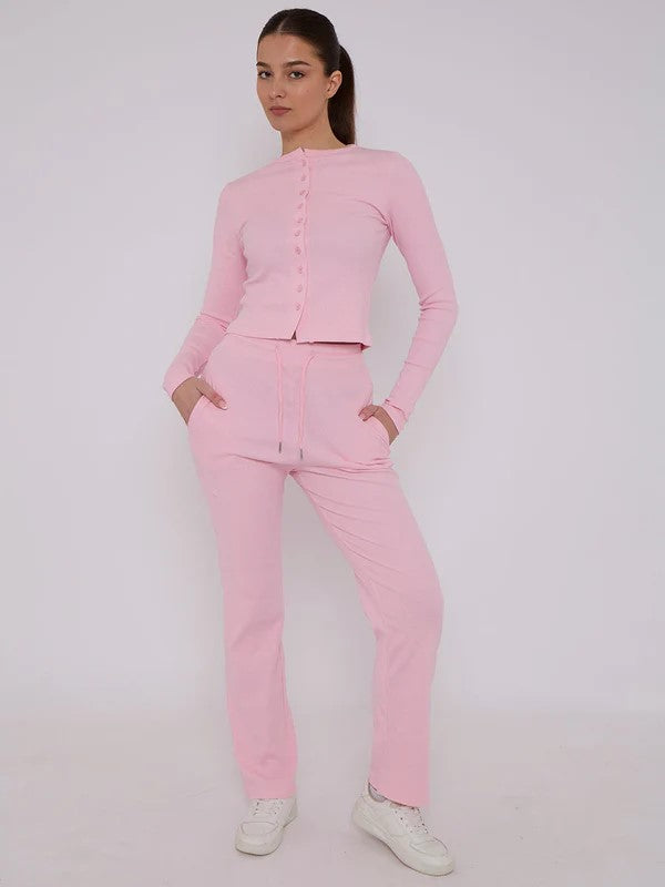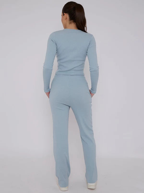 The Fine Rib Button Detail Top & Wide Leg Trouser Set blends comfort and sophistication — a wardrobe essential for those who love effortless, elevated style.